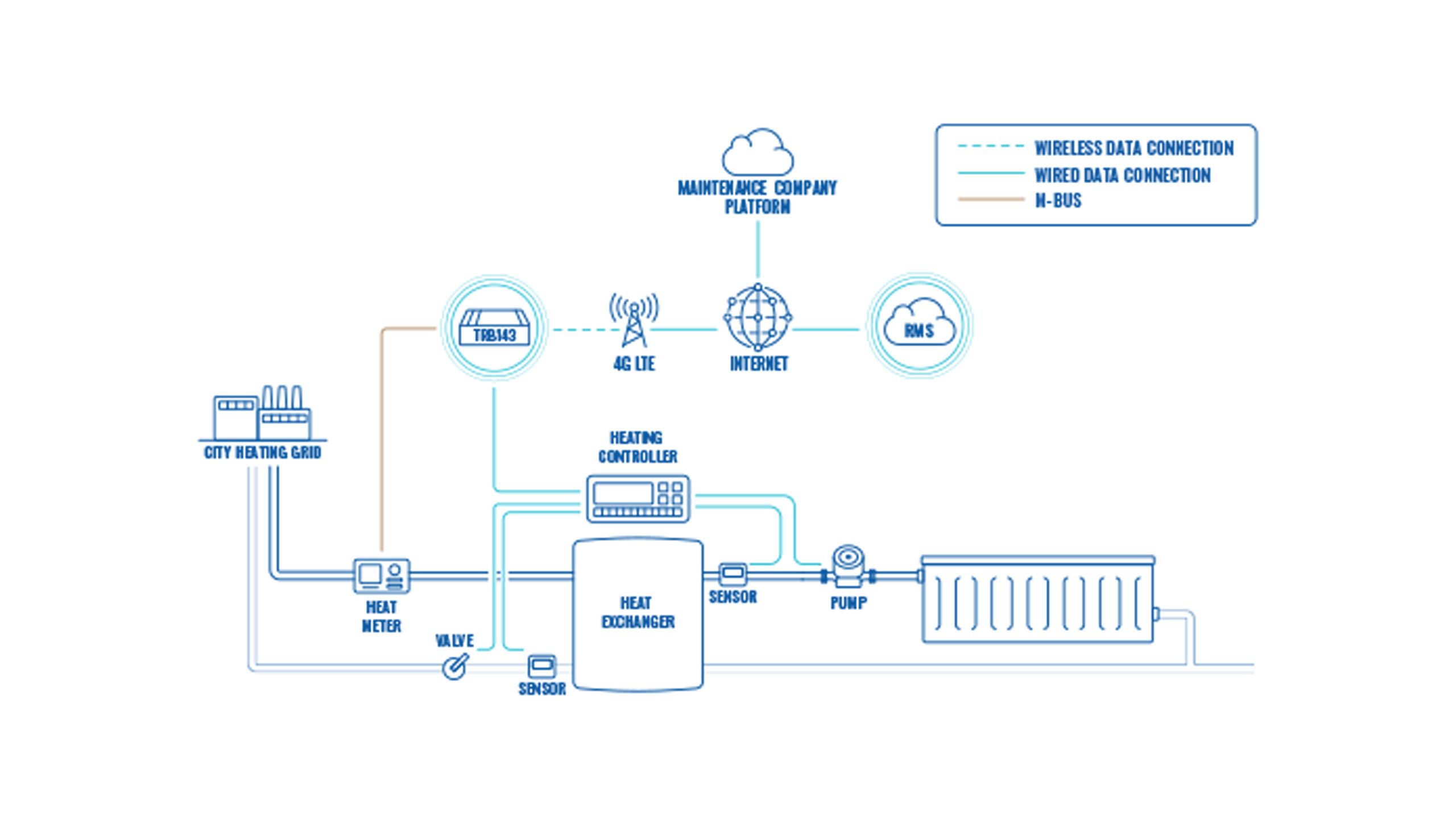 Using only a single TRB143 gateway per heating system, the heating usage data of all end clients can be remotely
